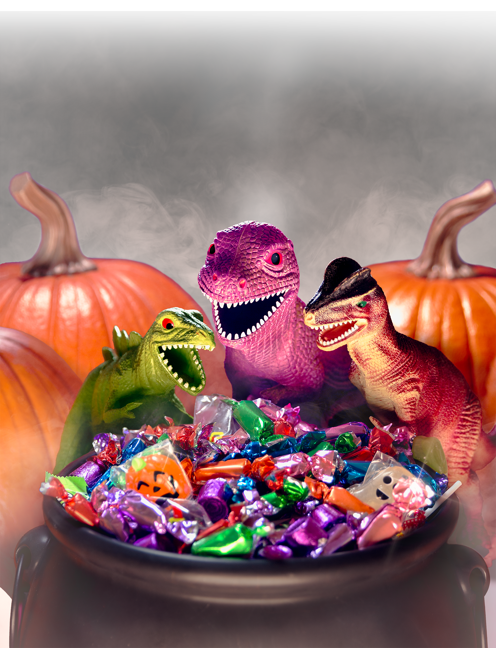 Who’s that knocking on your door? It may look like a skeleton, or a ghost, or a wolfman, but watch out—it might be DINOSAURS. The dinosaurs are after your candy, and they’re willing to go to outrageous lengths to get it. Be careful! If they don’t get their treats, things could get tricky …